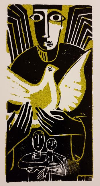 Hier sieht man Johann Henzinger bei der Arbeit am Druckstock eines Kaiserkars in seinem Atelier. Fast jeden Tag verbrachte er hier viele Stunden und die meisten seiner späteren Arbeiten entstanden hier. Hier setzte er sich intensiv mit der jeweiligen Thematik auseinander, studierte maßgebliche Werke wie z.B. beim Totentanz und auch bei den großen Göttinnen.